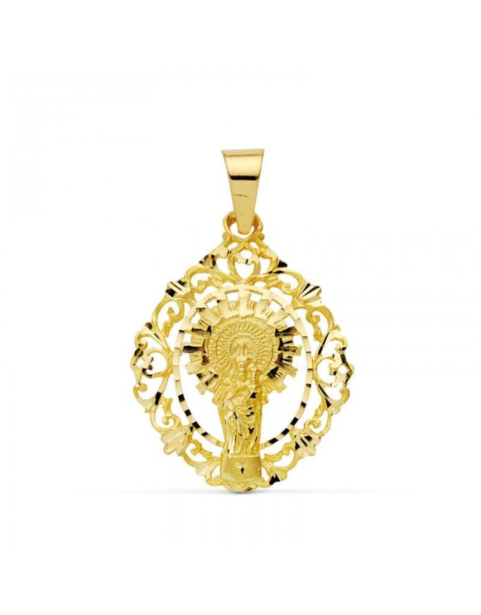 9kt yellow gold medal with figure of the Virgin of Pilar, carved and bordered with openwork ornaments. The medal is 36 mm high and 28 mm wide.