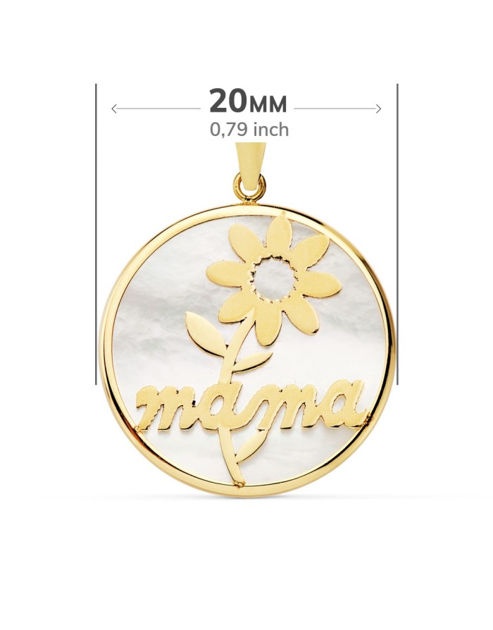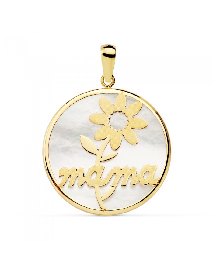 Round pendant in 18kt Gold 18kt with the word mum and spring flower with mother of pearl background -20mm