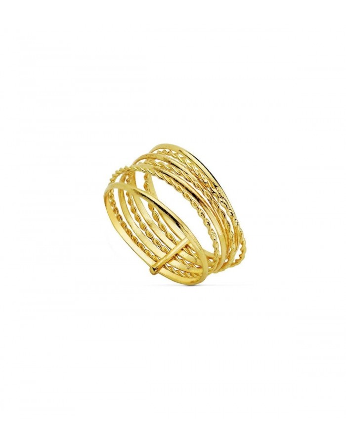 18KT yellow goldring by ArmaanJewellery. This ring is made up of smooth and braided threads of 1mm. wide each one. The finish of the ring is polished and at its widest part it measures 7mm.
