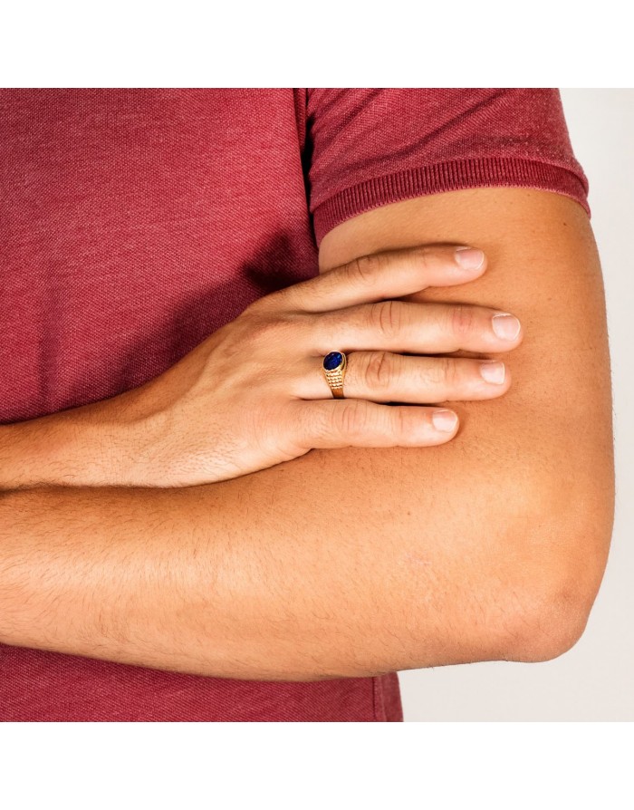 This men's stamp features a polished finish, carved sides and a Blue Sapphire coloured Spinel centre stone measuring 10 x 8 millimetres in size.