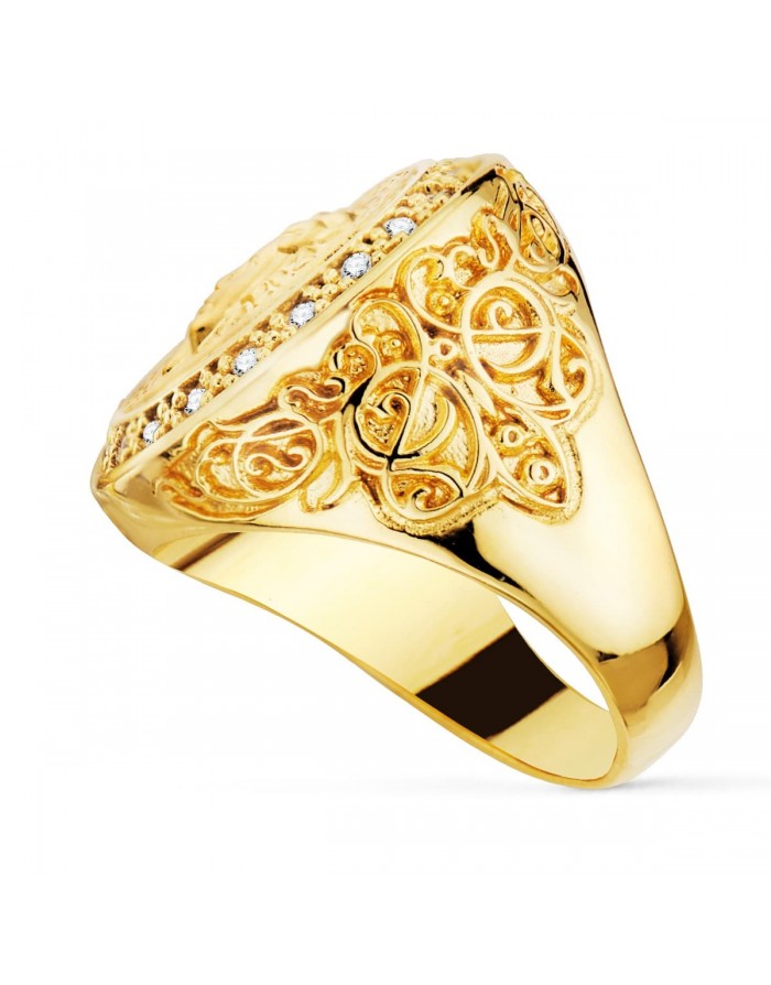 This signet ring has a round head and measures 20 millimetres in diameter. In the centre is embossed the figure of the Goddess Medusa, a symbol of protection from evil spirits in Greek mythology. This Goddess is crowned with brilliant-cut zirconia. The arm of this signet ring is adorned with a variety of carved motifs. The widest part of the signet ring measures 21 mm. The approximate weight of this fine and elegant jewellery is 17 grams.