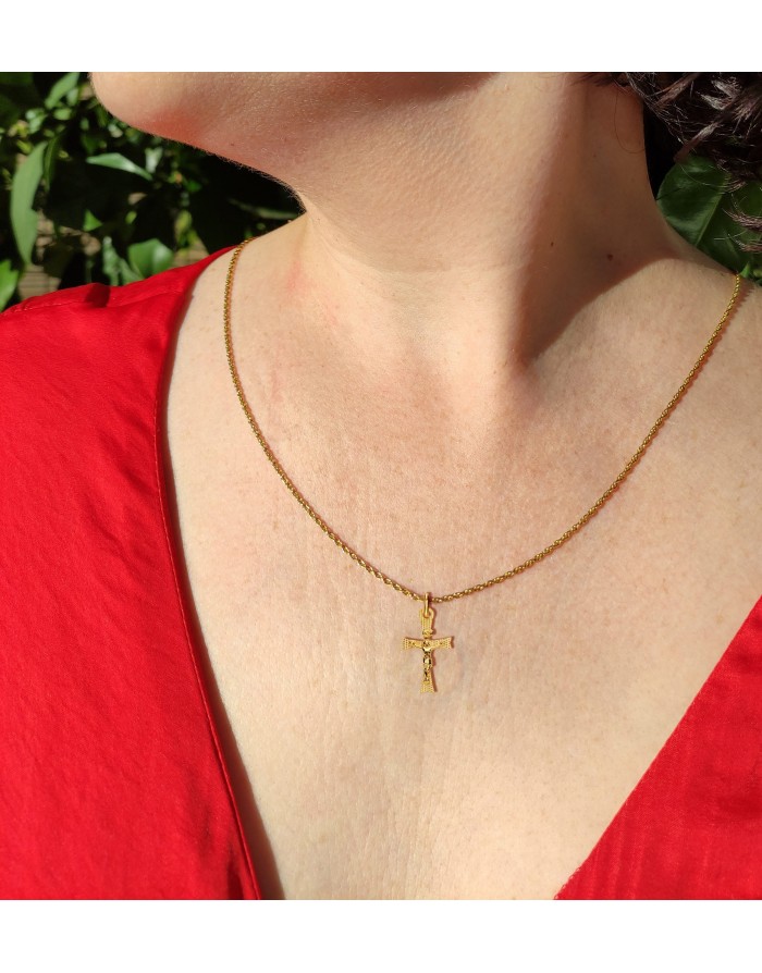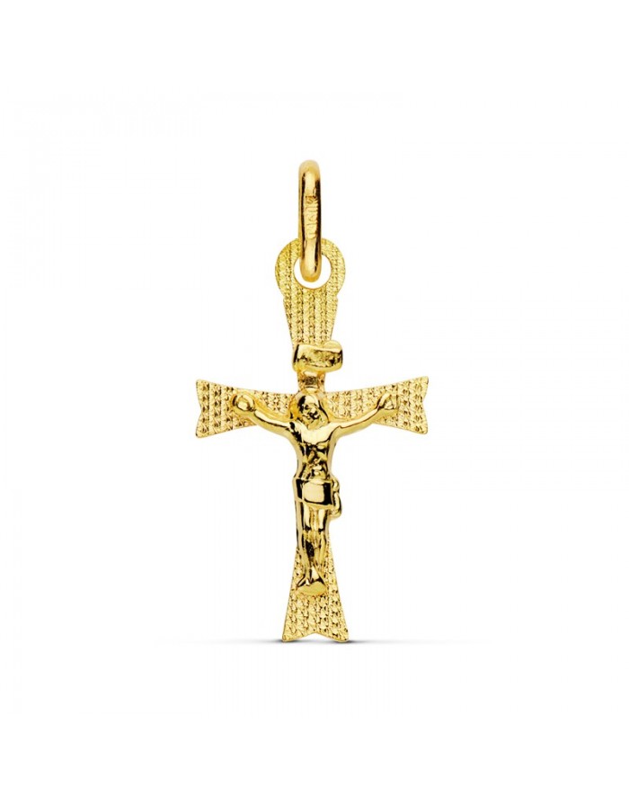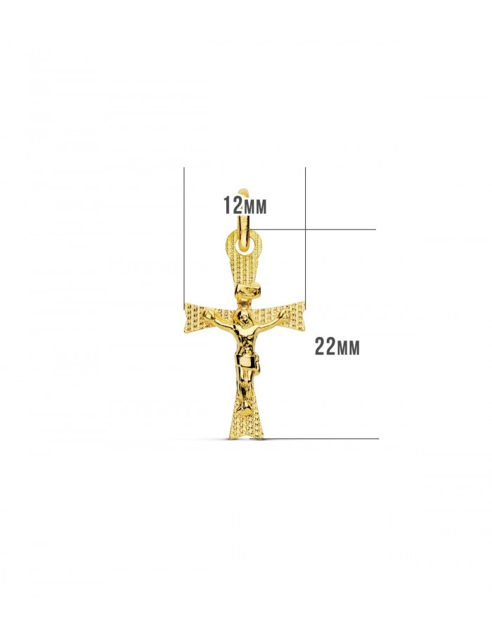 Christ figure cross in 18K yellow gold with a matte-brick finish from Joyas Armaan. This product has dimensions of 22 x 12mm.