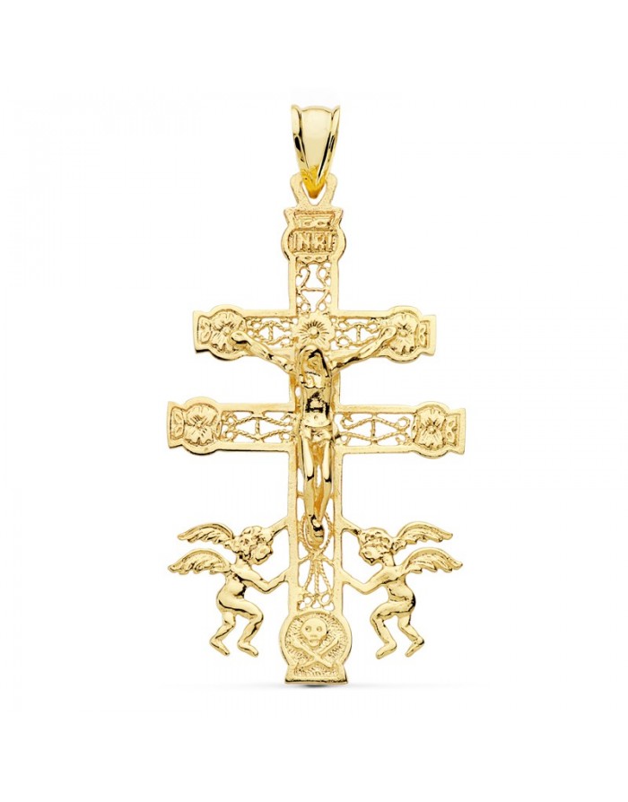 18K Yellow Gold Openwork Cross with a Shine finish by Joyas Armaan. This product has dimensions of 49x27mm and weighs approximately 5,65 grams.