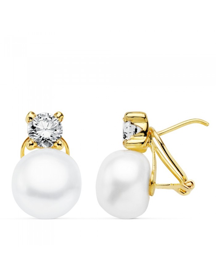 You and me pearl earrings made in 18K Yellow Gold by Joyas Armaan with omega clasp. This jewellery is made with white freshwater cultured pearls with a diameter of 10 mm. The stone of the earring is transparent zirconia.