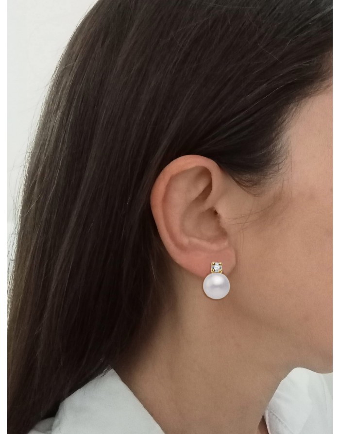 You and me pearl earrings made in 18K Yellow Gold by Joyas Armaan with omega clasp. This jewellery is made with white freshwater cultured pearls with a diameter of 11mm. The stone of the earring is Transparent coloured zirconia.